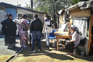 Des membres de l’équipe mobile de l’ONG Médecins du monde visitent un campement de la communauté rom, en Seine-Saint-Denis durant le premier confinement, le 15 avril 2020. ©Sarah BRETHES/AFP